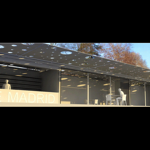 The Pavilion was a project created to serve as a place of exchange between visitors and informational resources about Madrid. The structure of the Pavilion has a unique awning made of perforated metal sheets that create a pattern when a shadow is cast. The awning protects visitors from the sun and other natural elements. The Pavilion itself is made up of three components; the external skin which serves as the facade, the main structure and an internal shell.